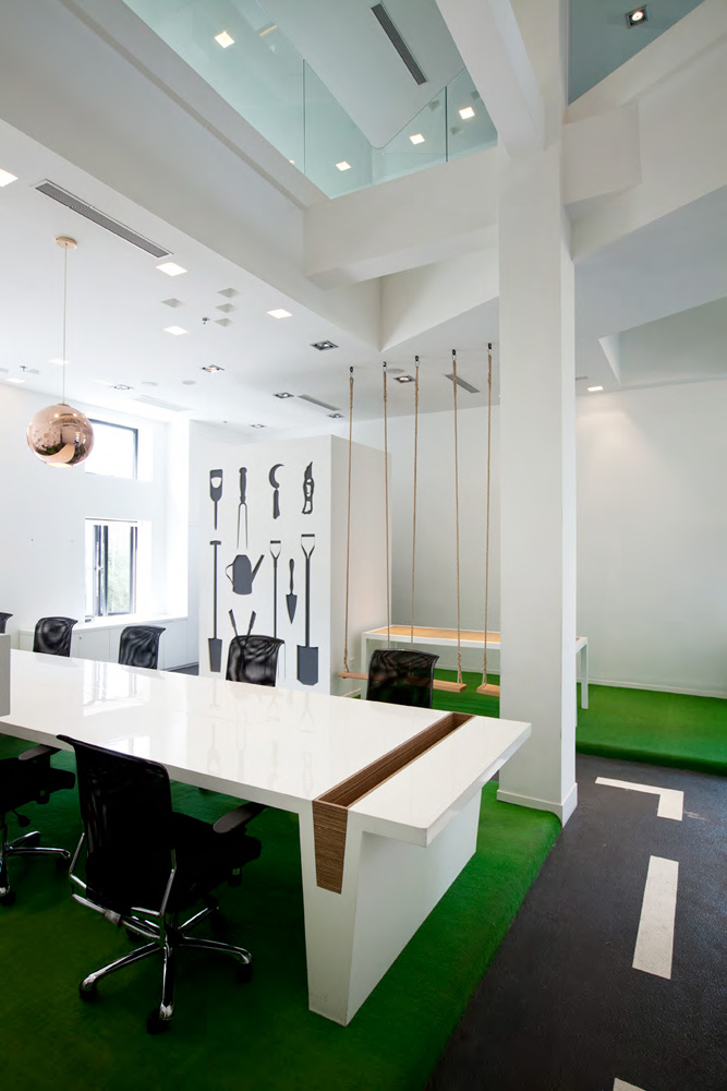 為了使整個(gè)辦公空間都能讓人有置身公園的感覺(jué),設(shè)計(jì)師盡可能的移入了戶外公園的概念元素: 鋪設(shè)在桌的綠色草坪好似在草地上辦公;墻上的園藝工具裝飾; 帶有童年色彩的秋千隨意的擺放在一旁,工作累了還能回歸下童年; 桌子上兩邊特意留出放置盆栽的花道,使整個(gè)辦公室到處都春意盎然 ……