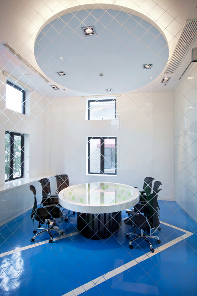 在這里,工作也似乎變得有趣輕松起來(lái):辦公室的地面上馬路交錯(cuò), 會(huì)議室的設(shè)計(jì)以網(wǎng)球場(chǎng)為雛形:網(wǎng)格的玻璃隔墻,藍(lán)色的網(wǎng)球場(chǎng)塑膠地面,嵌著網(wǎng)球的桌子……