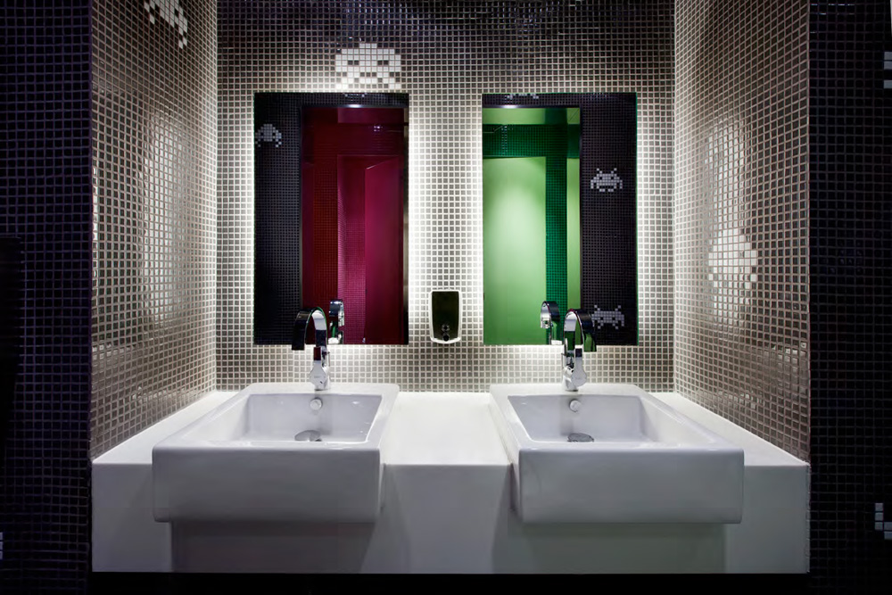就連最細(xì)節(jié)處的衛(wèi)生間的墻面,也借鑒了法國(guó)著名藝術(shù)家的涂鴉風(fēng)格,將小時(shí)候的游戲機(jī)中的形象作為馬賽克的圖案,在任何一個(gè)地方都不遺余力的想要呈現(xiàn)愉悅的感覺(jué)。 在體現(xiàn)時(shí)尚和輕松的辦公環(huán)境氛圍的同時(shí),設(shè)計(jì)師并沒(méi)有忘記辦公室所應(yīng)具有的功能和實(shí)用性,通過(guò)運(yùn)用高科技,在很多處運(yùn)用玻璃的隔墻和門(mén),既創(chuàng)造了一個(gè)開(kāi)放透明的空間,又更方便員工之間的交流。