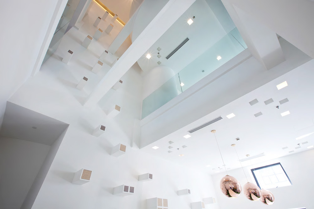 其次,在重塑內(nèi)部空間結(jié)構(gòu)時(shí), 以大樹(shù)枝干為靈感,營(yíng)造出生動(dòng)的線條感 ,并且在墻面上運(yùn)用向上排列的方格抽屜,讓人聯(lián)想到一格格花盆,種植在里面的植物不斷延伸向上,更好的體現(xiàn)了在“在公園里工作”的主題。