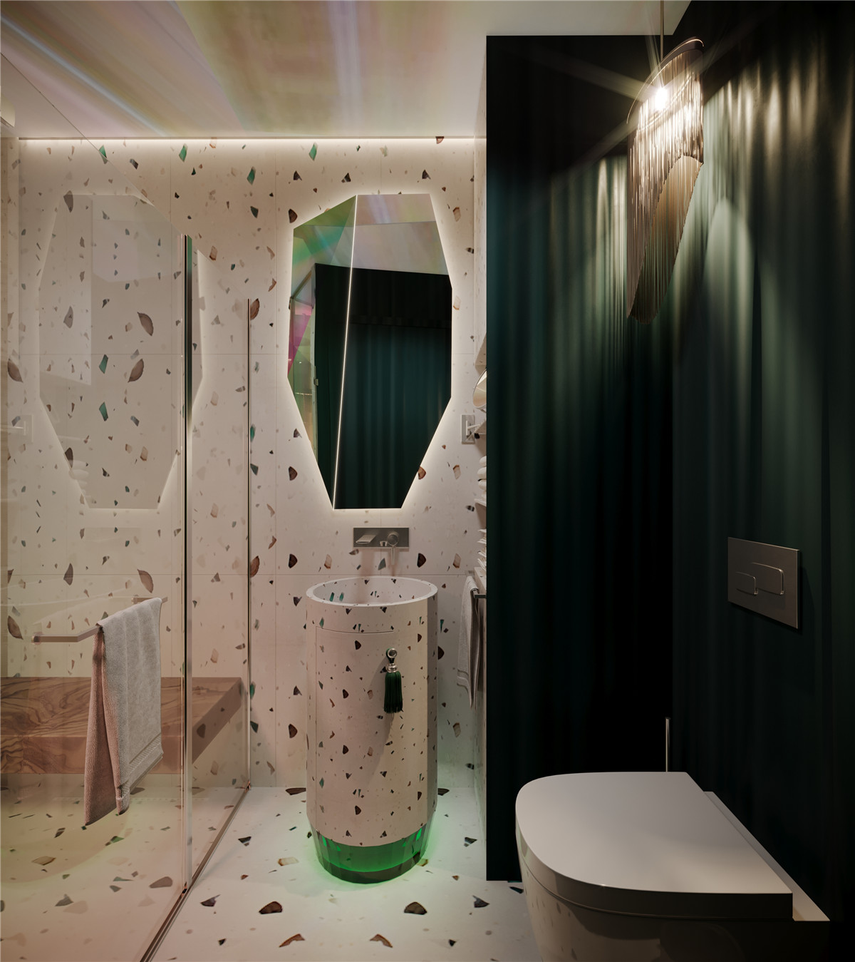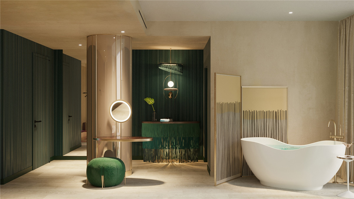 在客房中,這里的氛圍更加溫馨和舒緩。寶石色的家具在溫暖的白色背景墻中脫穎而出。床頭板后面特別設(shè)計(jì)的棱鏡和聚光燈系統(tǒng)在墻壁上散發(fā)出神奇的效果。浴室墻壁上的彩色玻璃條紋延續(xù)了光線的相互作用,全天改變了房間的氣氛。玻璃的一側(cè)是透明的,另一側(cè)是磨砂的,以確保隱私。