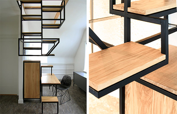 荷蘭設(shè)計師Mieke Meijer打造了一個具有儲物功能的樓梯。這個樓梯分兩個部分,上部高低兩排的懸浮鏤空結(jié)構(gòu)使其在具備儲物功能的同時也方便行走,而下部由儲物柜和辦公桌組成。這樣的設(shè)計方式在考慮樓梯自身功能的同時,也有效的利用了空間。